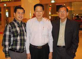 砂拉越河婆同乡会会长蔡展文(左)与38365总会长拿督黄汉良(中),以及秘书长黄源清相见欢。
